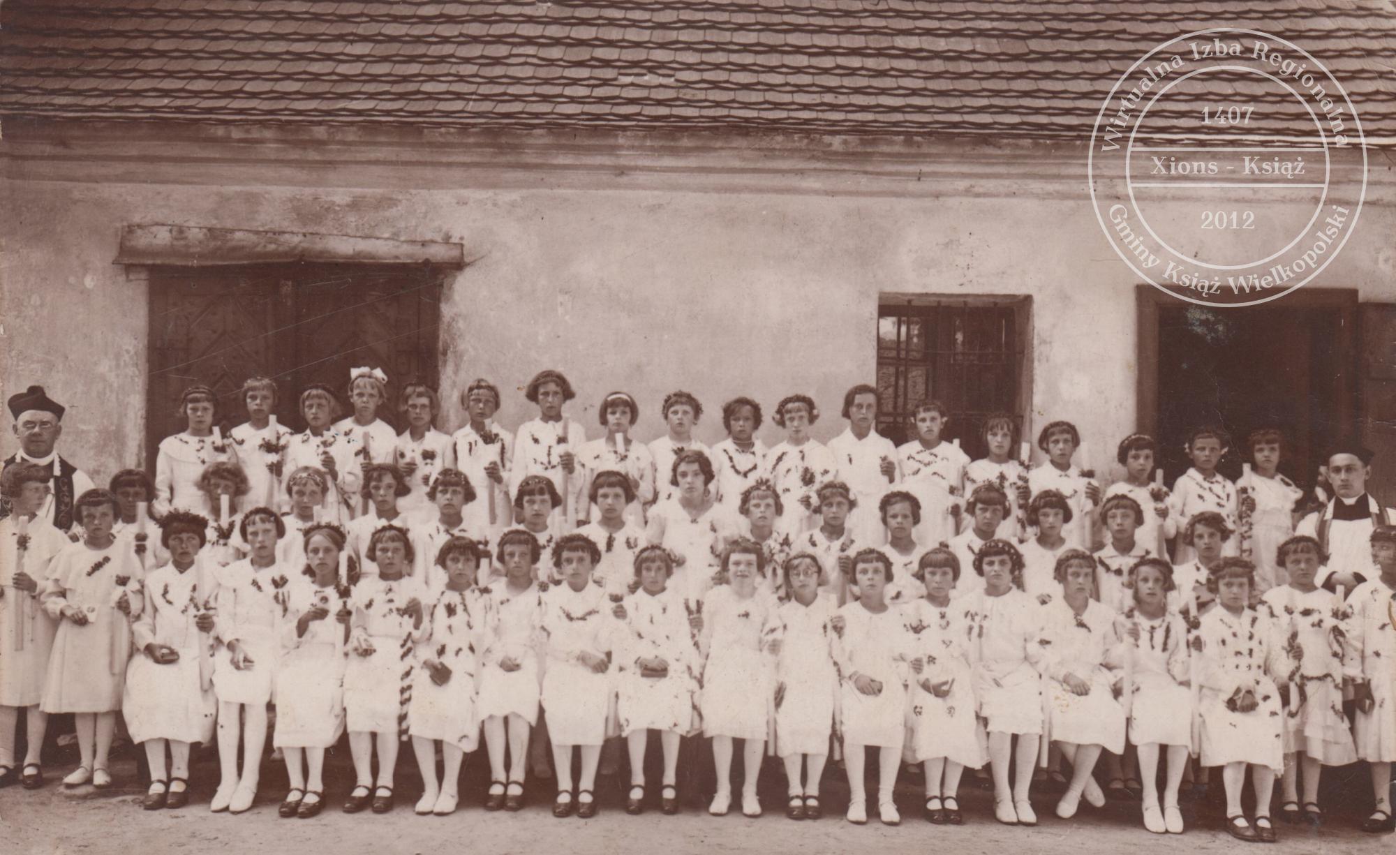 Pamiątkowe zdjęcie Pierwszej Komunii w parafii św. Mikołaja w Książu z 1934 roku.